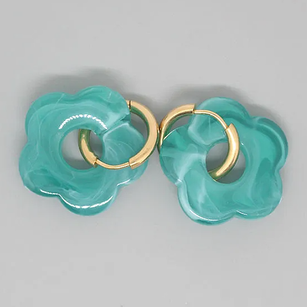 Boucles d'oreilles composées d'un anneau décoré d'une fleur en acrylique vert.